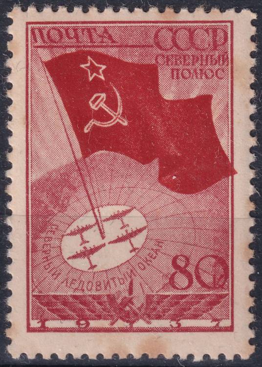 1938, SSSR, 0587za, ✈ Letecký transport polární expedice k výzkumné stanici "Severní pól 1" na Rudolfův ostrov (1937): vlajka SSSR na Severním pólu ✶✶