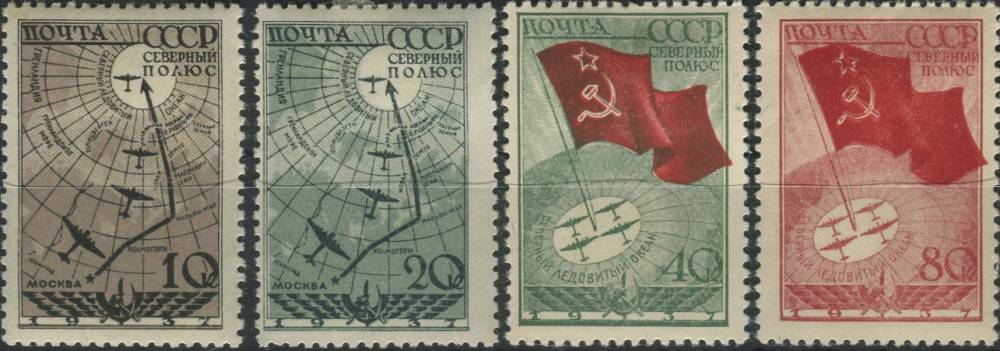 1938, SSSR, 0584/0587, ✈ Letecký transport polární expedice k výzkumné stanici "Severní pól 1" na Rudolfův ostrov (1937) ✶