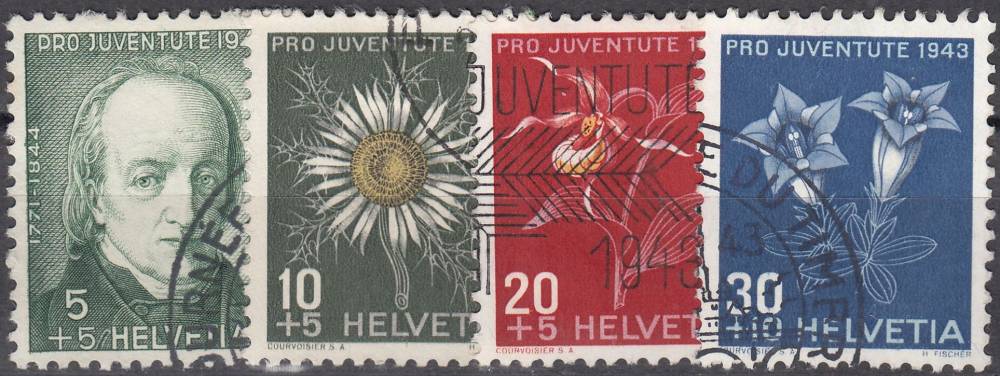 1943, Švýcarsko, 0424/0427, Pro Juventute: 100. výročí úmrtí Emanuel Fellenbergera, Květiny, ⊙