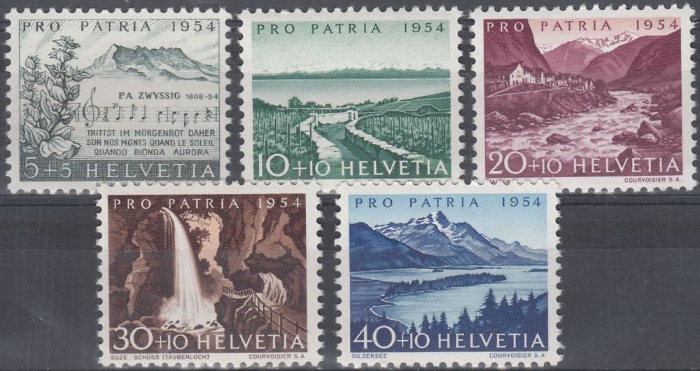 1954, Švýcarsko, 0597/0601, Pro Patria: 100. výročí úmrtí P. A. Zwyssiga, Jezera a vodopády **