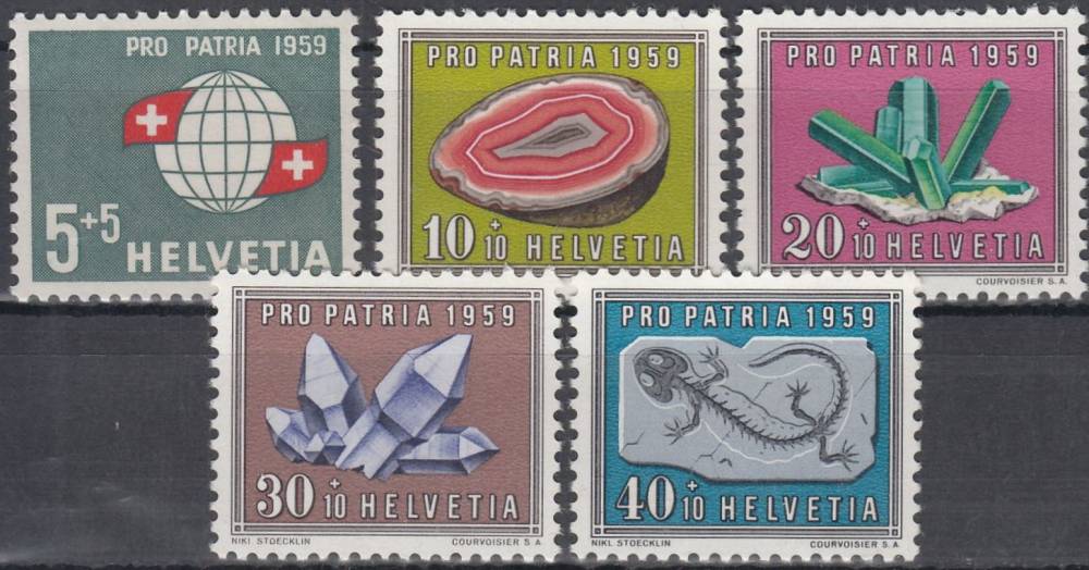 1959, Švýcarsko, 0674/0678, Pro Patria: Švýcaři v zahraničí, Minerály a zkameněliny **