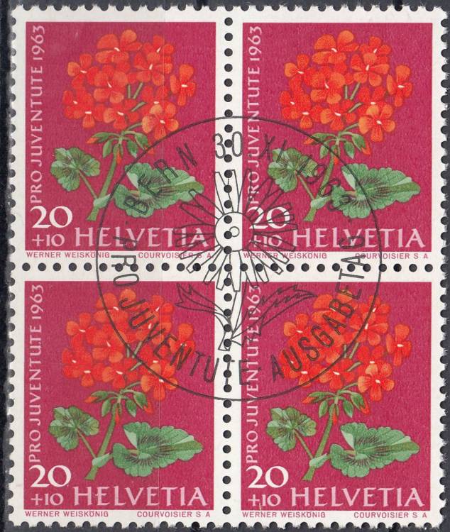 1963, Švýcarsko, 0788x, Pro Juventute: Zahradní květiny - Pelargonium hybr. ⊙ 4blok