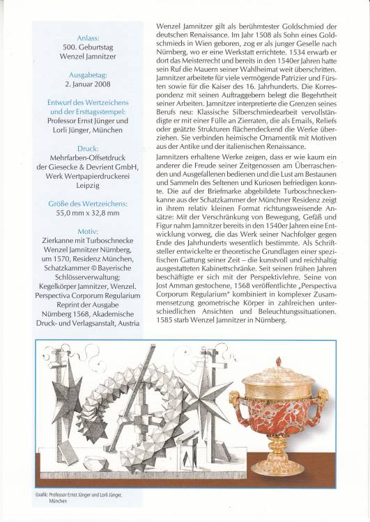 2008, Německo, ETB03/2008, 500. výročí narození Wenzela Jamnitzera