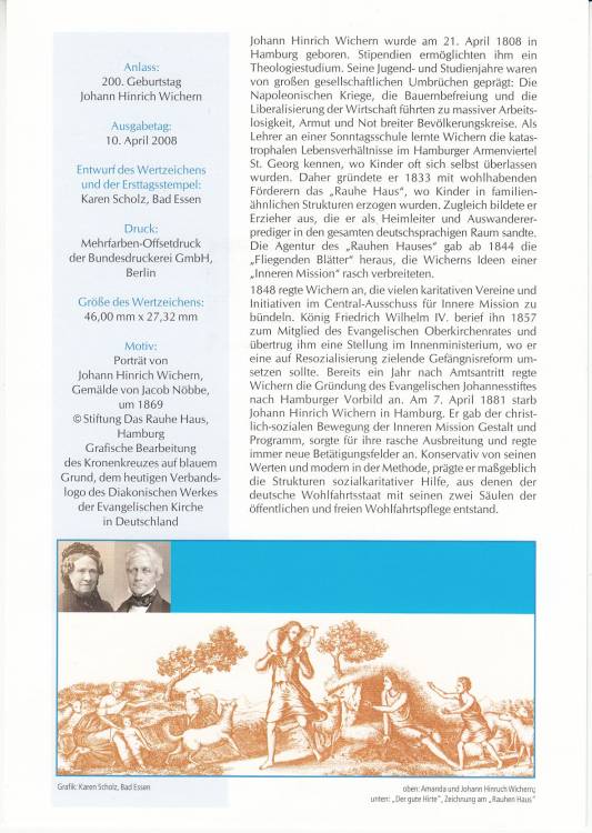 2008, Německo, ETB13/2008, 200. výročí narození Johanna Hinricha Wichernea