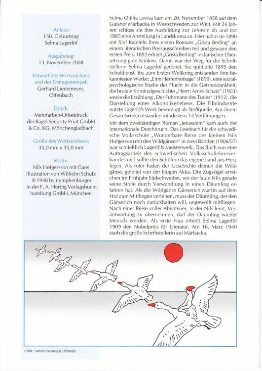 2008, Německo, ETB42/2008, 150. výročí Selmy Lagerlöfové