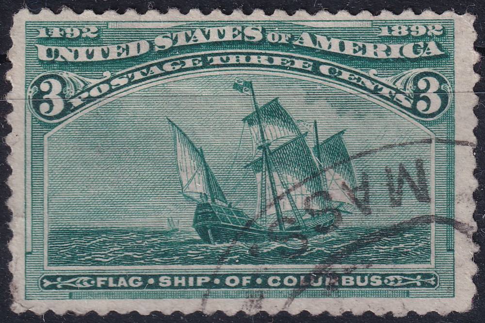 1893, USA, 0075, 400. výročí objevení Ameriky Kryštofem Kolumbem, Kolumbova světová výstava v Chicagu, IL: Karavela "Santa Maria", vlajková loď Kolumba ⊙