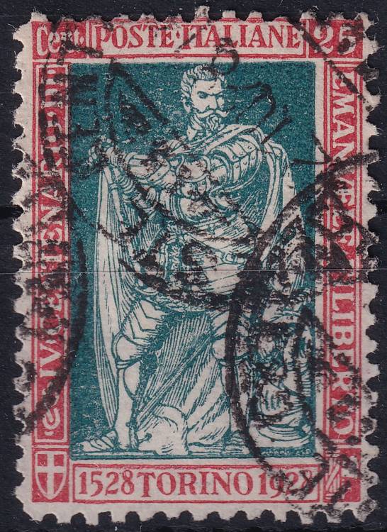 1928, Itálie, 0286A, 400. výročí narození knížete Filiberta Savojského, 10. výročí vítězství: Kníže Emanuel Filibrt Savojský stojící ⊙