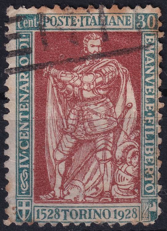 1928, Itálie, 0287A, 400. výročí narození knížete Filiberta Savojského, 10. výročí vítězství: Kníže Emanuel Filibrt Savojský stojící ⊙