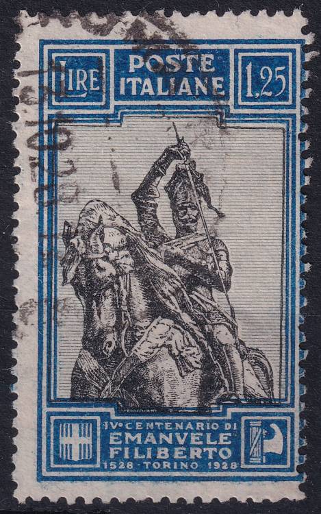 1928, Itálie, 0290B, 400. výročí narození knížete Filiberta Savojského, 10. výročí vítězství: Jezdecký obraz knížete Emanuela Filiberta v Turíně ⊙