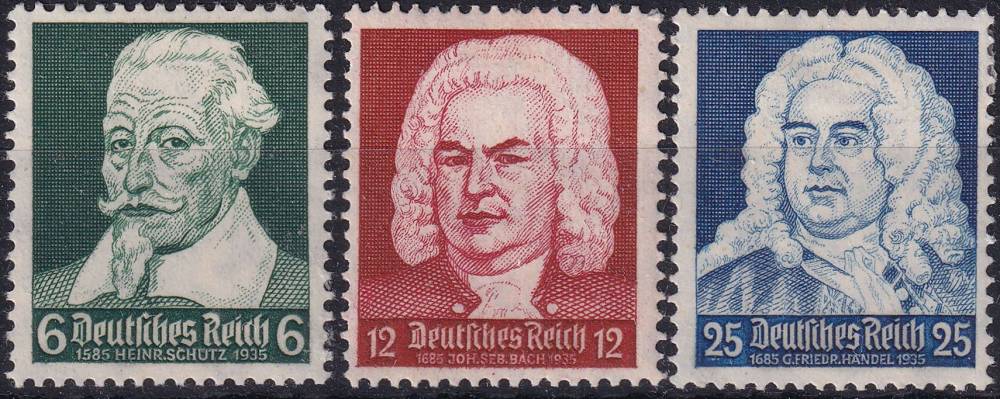 1935, Deutsches Reich, 0573/0575, 350. výročí narození Heinricha Schütze; 250. výročí narození Johanna Sebastiana Bacha a Georga Friedricha Händela ✶