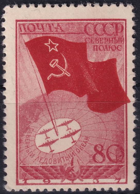 1938, SSSR, 0587za, Letecké známka: Letecký transport polární expedice k výzkumné stanici "Severní pól 1" na Rudolfův ostrov (1937) - Vlajka SSSR a Severní pól ✶✶