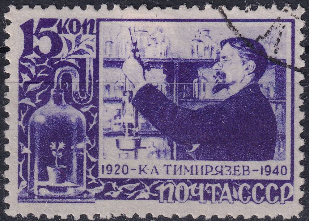 1940, SSSR, 0750I, 20. výročí úmrtí Klimenta Timirjaseva: Kliment Timirjasev v laboratoři ⊙