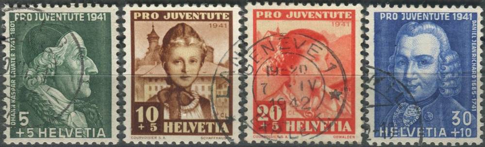 1941, Švýcarsko, 0399/0402, "Pro Juventute": 200. výročí narození Johanna Kaspara Lavatara; 200. výročí úmrtí Daniela Jeanricharda; Kroje ⊙