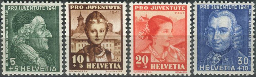 1941, Švýcarsko, 0399/0402, "Pro Juventute": 200. výročí narození Johanna Kaspara Lavatera; 200. výročí úmrtí Daniela Jeanricharda; Kroje ∗∗