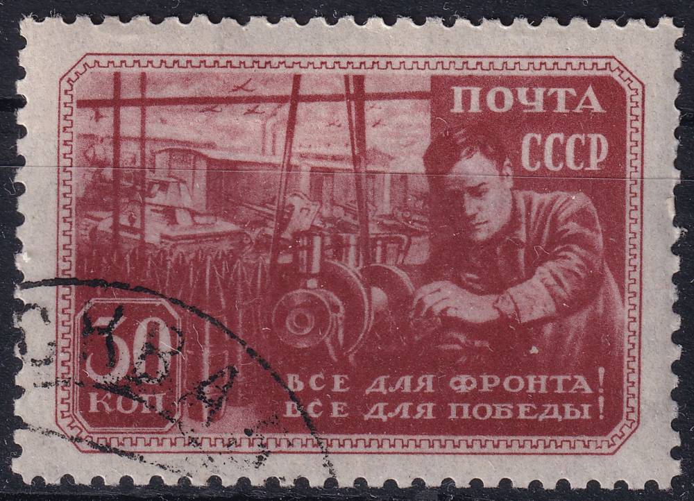1943, SSSR, 0839xb, "Velká Vlastenecká válka 1941 - 1945 (I): Bojové scény - Dělník v muniční továrně ⊙
