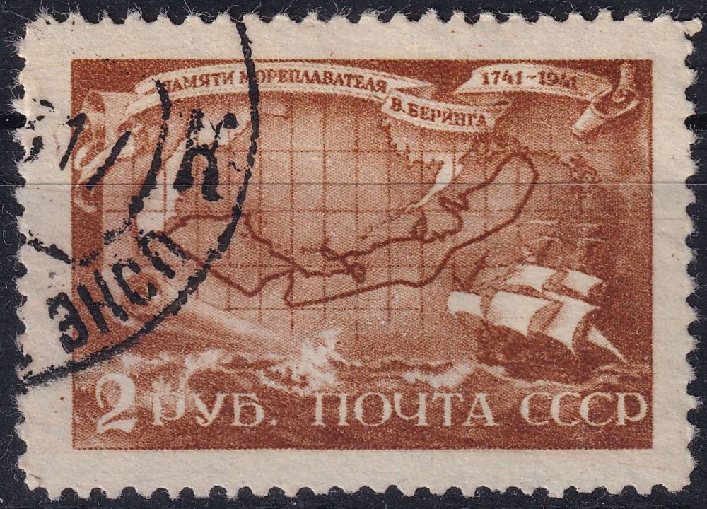 1943, SSSR, 0859rx, 200. výročí úmrtí Vituse Jonassena Beringa: Mapa cesty expedice, Plachetnice "Svatý Petr" ⊙
