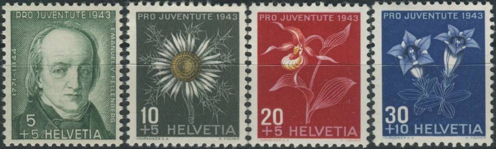 1943, Švýcarsko, 0424/0427, "Pro Juventute": 100. výročí úmrtí Emanuela Fellenbergera; Květiny ∗