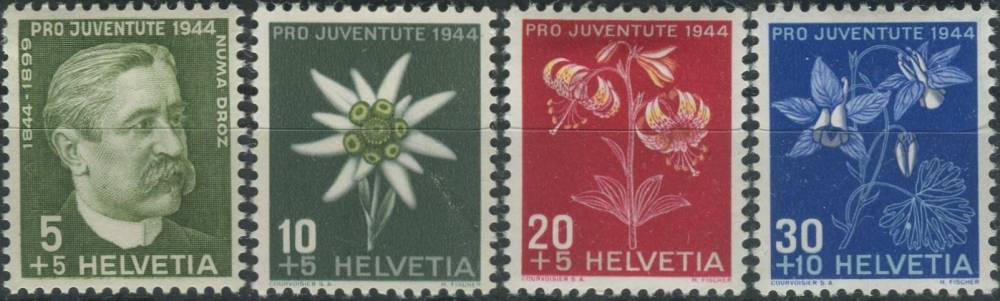 1944, Švýcarsko, 0439/0442, "Pro Juventute": 100. výročí narození Numy Droze; Květiny ∗