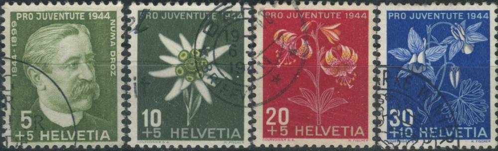 1944, Švýcarsko, 0439/0442, "Pro Juventute": 100. výročí narození Numy Droze; Květiny ⊙