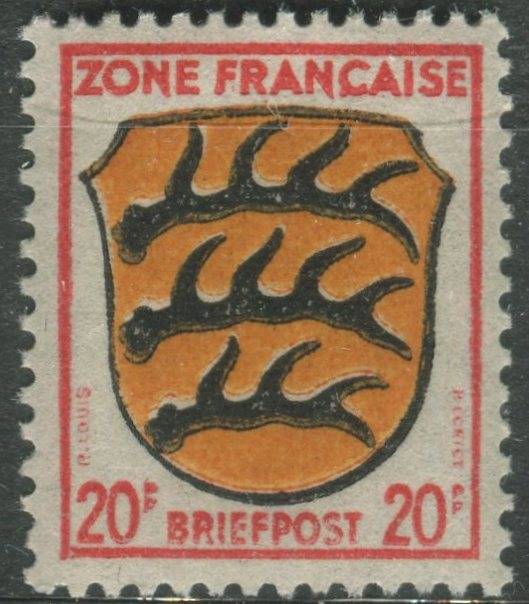 1945, Francouzská okupační zóna (Všeobecná vydání), 08, Výplatní známka: Znaky zemí francouzské zóny - Württembersko ∗∗