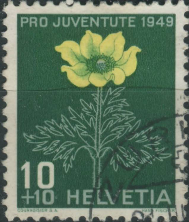 1949, Švýcarsko, 0542, "Pro Juventute": Alpské květiny - Pulsatilla alpina sap. sulphurea ⊙