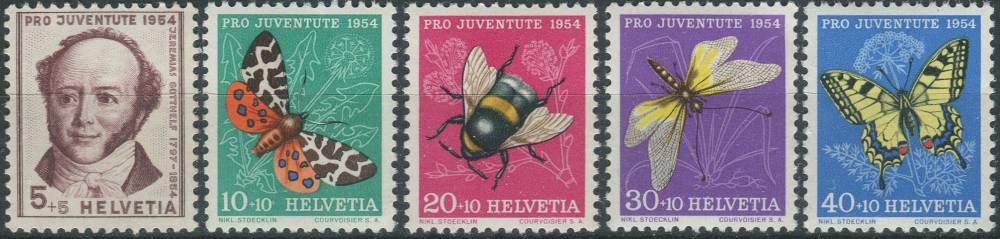 1954, Švýcarsko, 0602/0606, "Pro Juventute": 100. výročí úmrtí Jeremiase Gotthelfa; Hmyz ∗∗