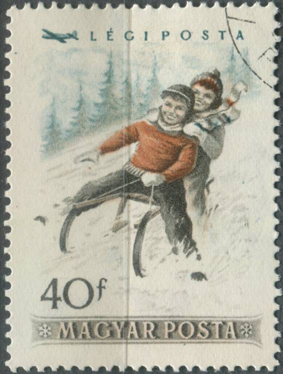 1955, Maďarsko, 1409, Letecká známka: Zimní sport - Dvě děti na sáňkách ⊙