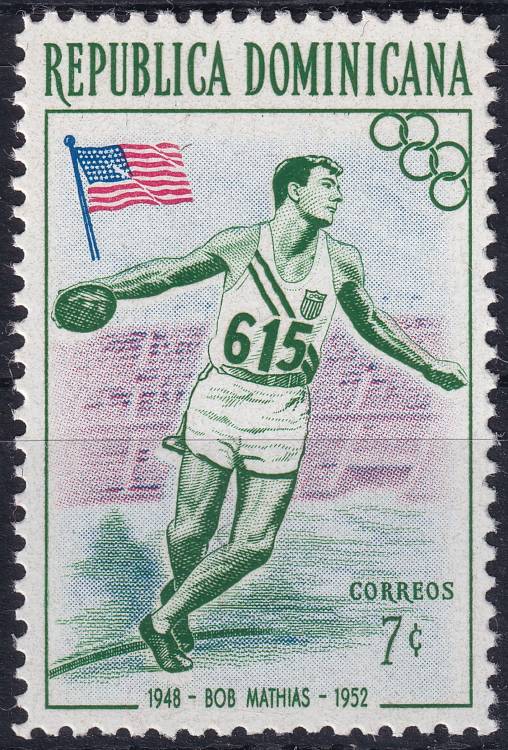 1957, Dominikánská republika, 0564A, Letní olympijské hry 1956, Melbourne (I): Dřívější olympijší vítězové - Bob Mathias, USA (1948 a 1952) ✶✶
