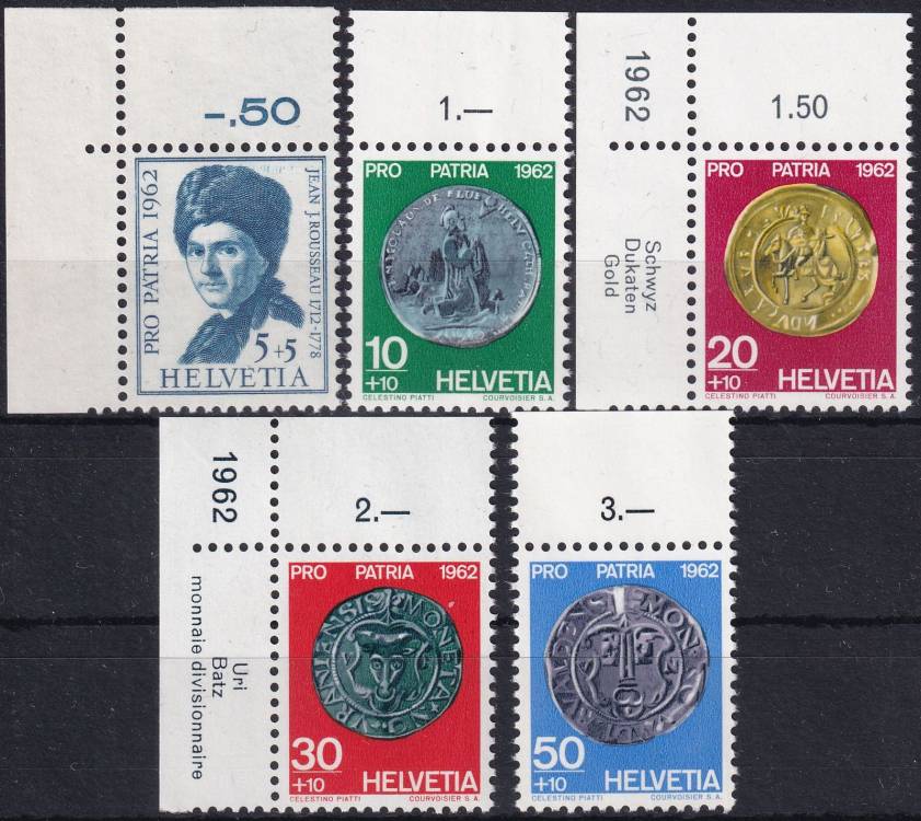 1962, Švýcarsko, 0751/0755p, "Pro Patria": 250. výročí narození Jeana-Jacquese Rousseaua; mince ✶✶ o H