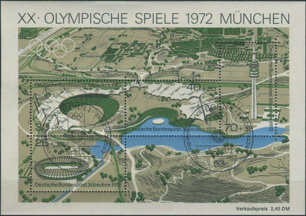 • černá strojová pamětní razítka: BONN 1/5.7.1972/1. Olympianmarken Block´72, ERSTAGAUSGABE