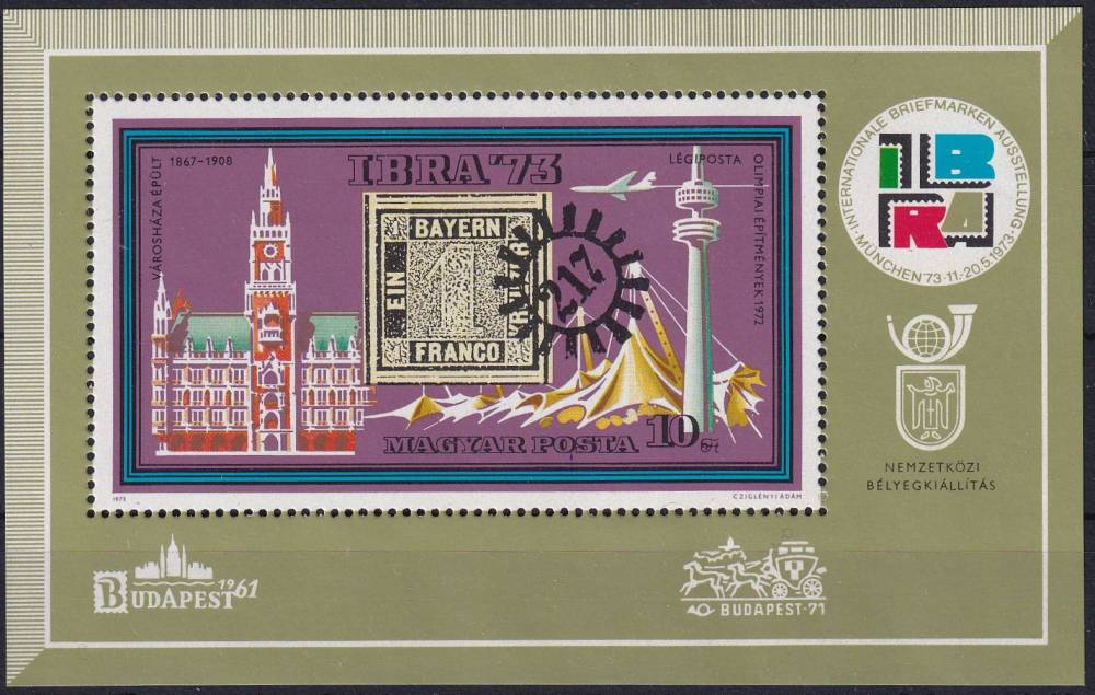 1973, Maďarsko, A097A, Letecký aršík: Mezinárodní výstava poštovních známek IBRA, Mnichov a filatelistická Světová výstava POLSKA 73, Poznaň ✶✶