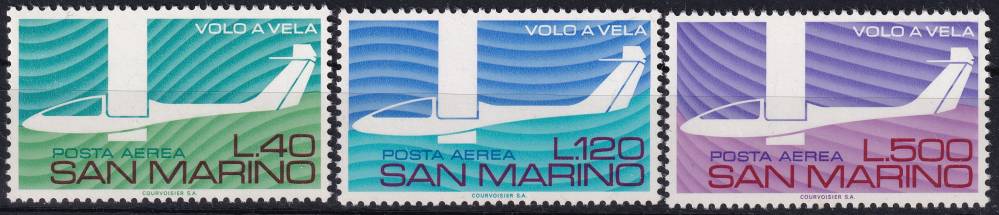 1974, San Marino, 1077/1079, Letecké známky: 50 let bezmotorového leteckého sportu v Itálii ✶✶