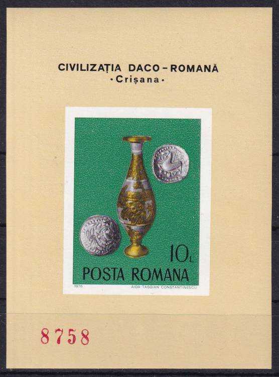 1976, Rumunsko, A132, Dácké a římské archeologické nálezy (I): Stříbrná váza se zlatým zdobením, stříbrné mince ✶✶