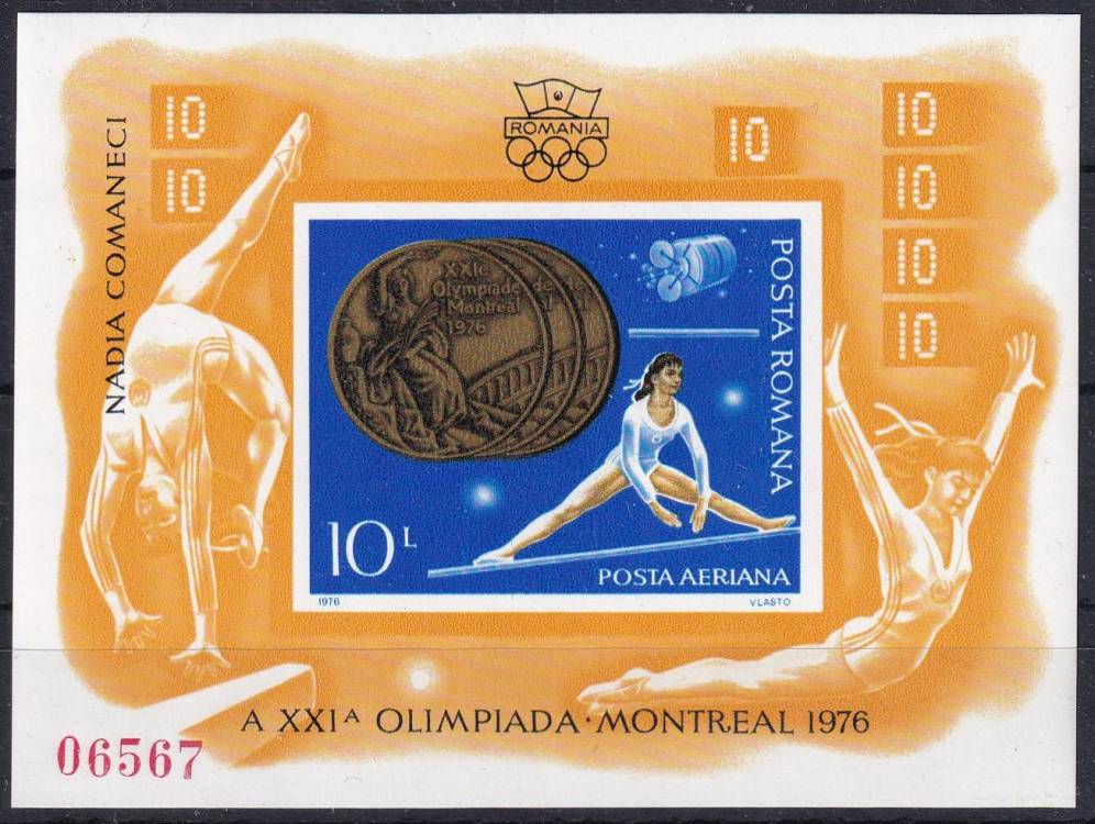 1976, Rumunsko, A138, Letecký: Medailisté z letních olympijských her v Montrealu: Cvičení na kladině - Nadia Comaneci (3 zlaté,1 stříbrná, 1 bronzová medaile) ✶✶