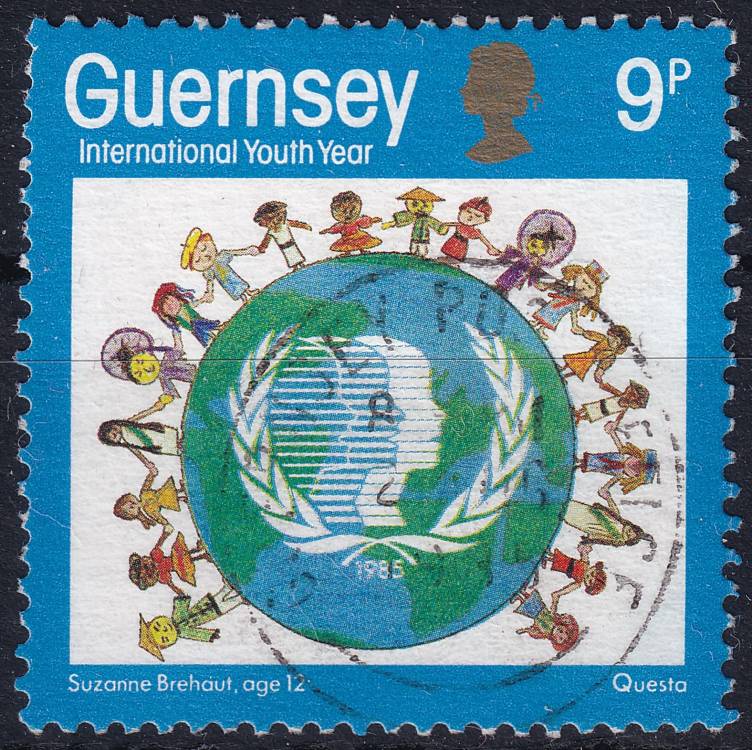 1985, Guernsey, 0320, Mezinárodní rok mládeže: Dětské kresby - Děti na zeměkouli od Suzanne Brehautové (12 let) ⊙