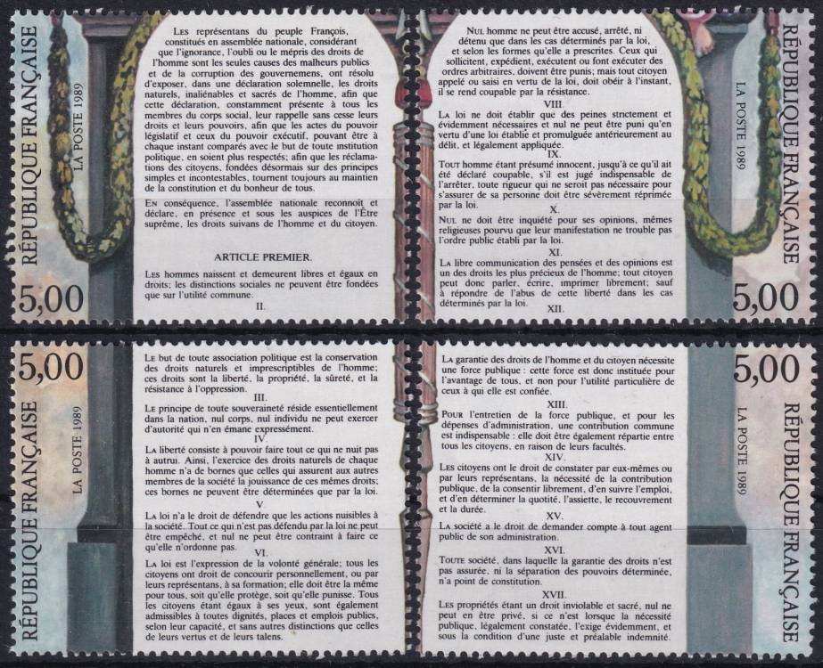 1989, Francie, 2728/2731, 200. výročí Francouzské revoluce - Vyhlášení práv člověka a občana; Mezinárodní výstava poštovních známek PHILEXFRANCE ´89, Paříž ✶✶