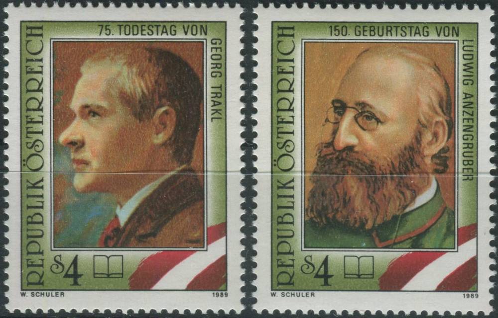 1989, Rakousko, 1974/1975, 75. výročí úmrtí Georga Trakla; 150. výročí narození Ludwiga Anzengrubera ∗∗