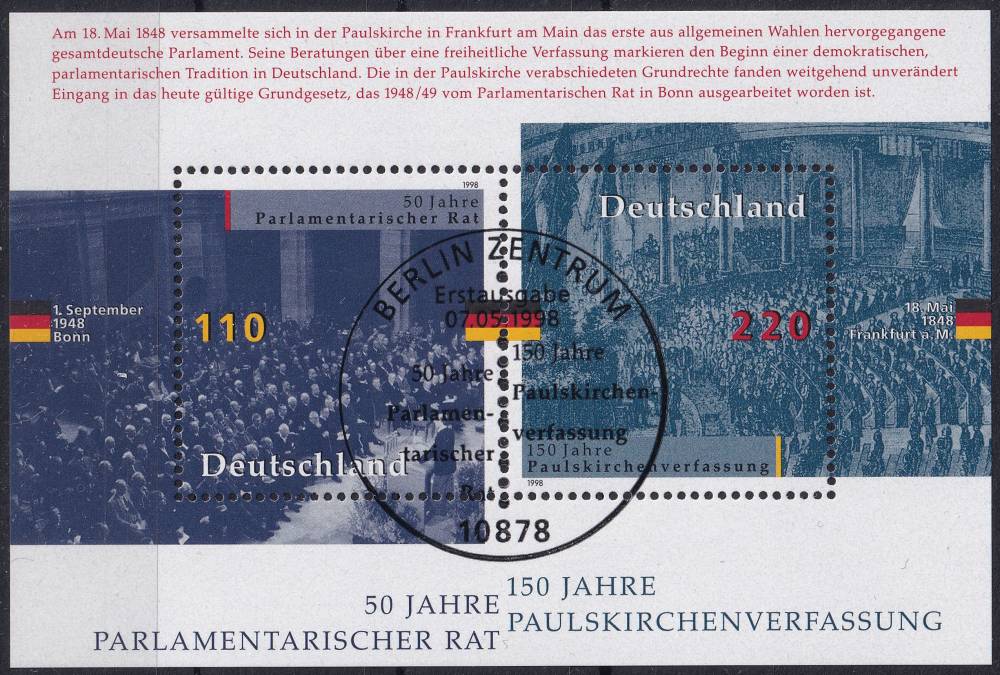 • černé strojové pamětní razítko: BERLIN ZENTRUM /07.05.1998/50 Jahre Parlamentarischer Rat, 150 Jahre Paulskrichenverfassung