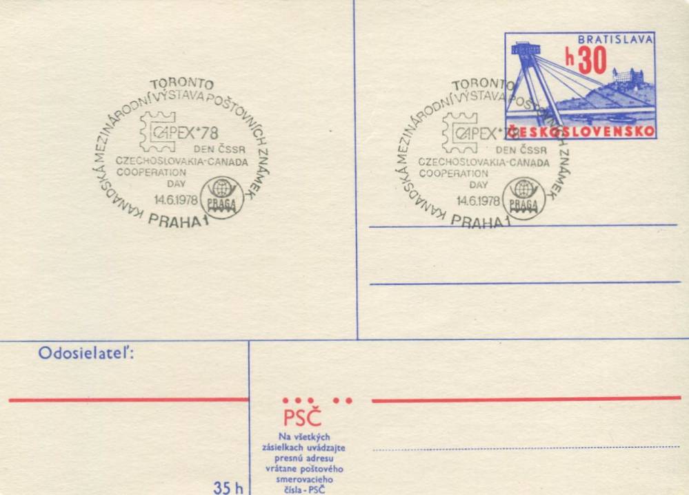 • text: PRAHA 1/14.6.1978/KANADSKÁ MEZINÁRODNÍ VÝSTAVA POŠTOVNÍCH ZNÁMEK CAPEX ´78, DEN ČSSR, CZECHOSLOVAKIA-CANADA COOPERATION DAY