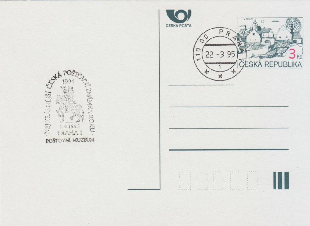 • pamětní razítko: PRAHA 1 POŠTOVNÍ MUZEUM/1.4.1995/NEJKRÁSNĚJŠÍ ČESKÁ POŠTOVNÍ ZNÁMKA ROKU