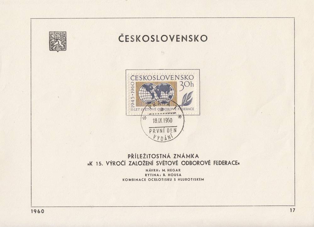 1960, ČSR II, NL1141, 15. výročí Světové odborové federace, NL17