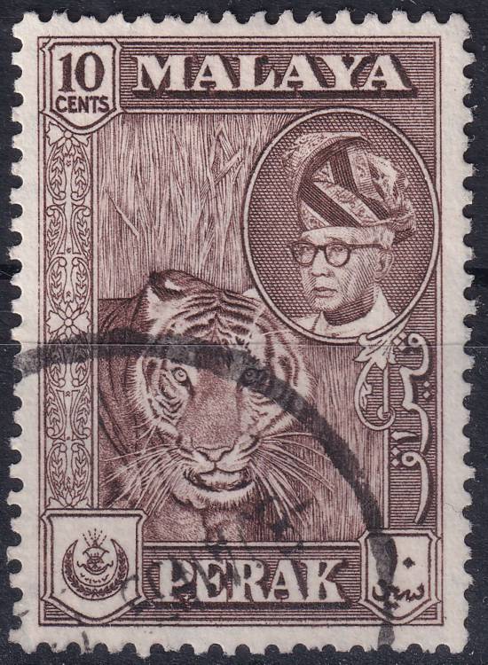 1957, Malajsko - Perak, 108a, Výplatní známka: Sultán Jussuf Izzuddin Šáh a zemské pohledy - Panthera tigris ⊙