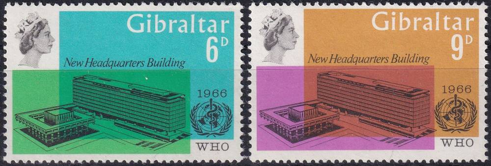 1966, Gibraltar, 0182/0183, Slavnostní otevření nové úřední budovy Světové zdravotnické organizace (WHO) v Ženevě ✶✶
