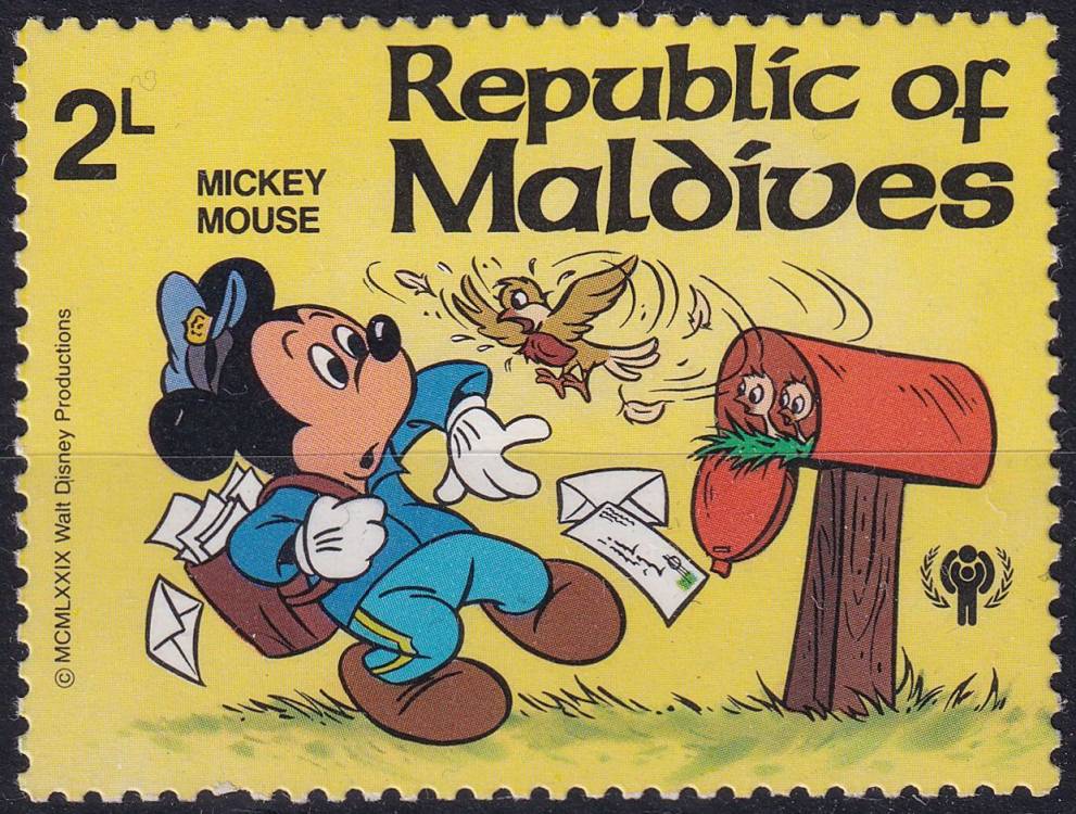 1979, Maledivy, 0849, Figurky Walta Disneye: Mickey Mouse a poštovní schránka jako hnízdo ✶✶