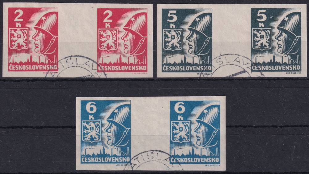 1945, ČSR II, 0354/0356Mv(2), Výplatní známky: Košické vydání - Hlava rudoarmějce a státní znak ⊙