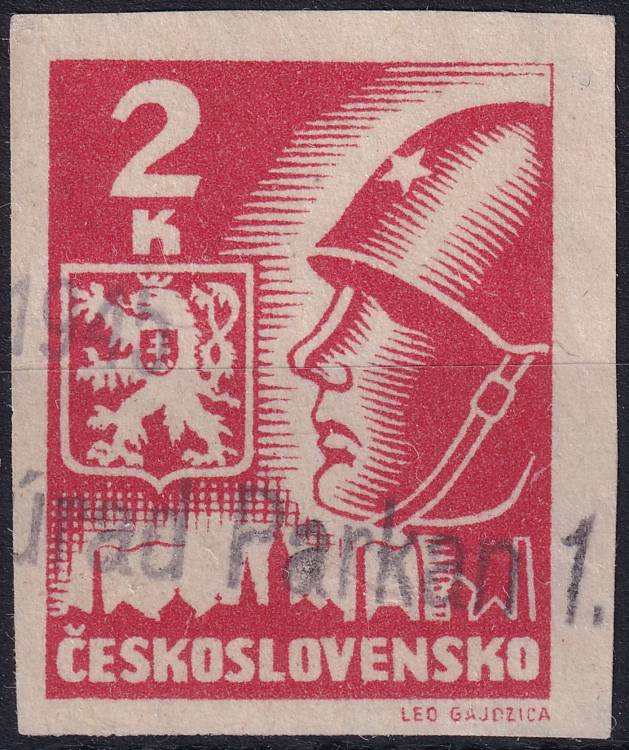 1945, ČSR II, 0354, Výplatní známka: Košické vydání: Hlava rudoarmějce a státní znak ⊙