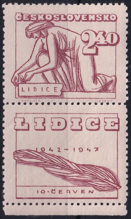 1947, ČSR II, 0455KD, 5. výročí vyhlazení Lidic: Klečící žena ✶ o D