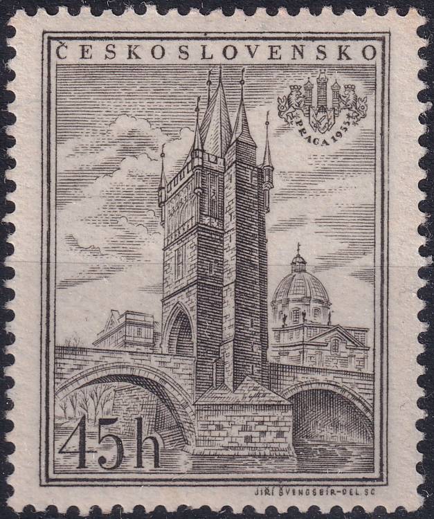 1955, ČSR II, 0854A, Mezinárodní výstava poštovních známek PRAGA 1955: Staroměstská Mostecká věž ✶✶