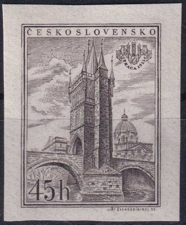 1955, ČSR II, 0854BV, Mezinárodní výstava poštovních známek PRAGA 1955: Staroměstská Mostecká věž ✶✶